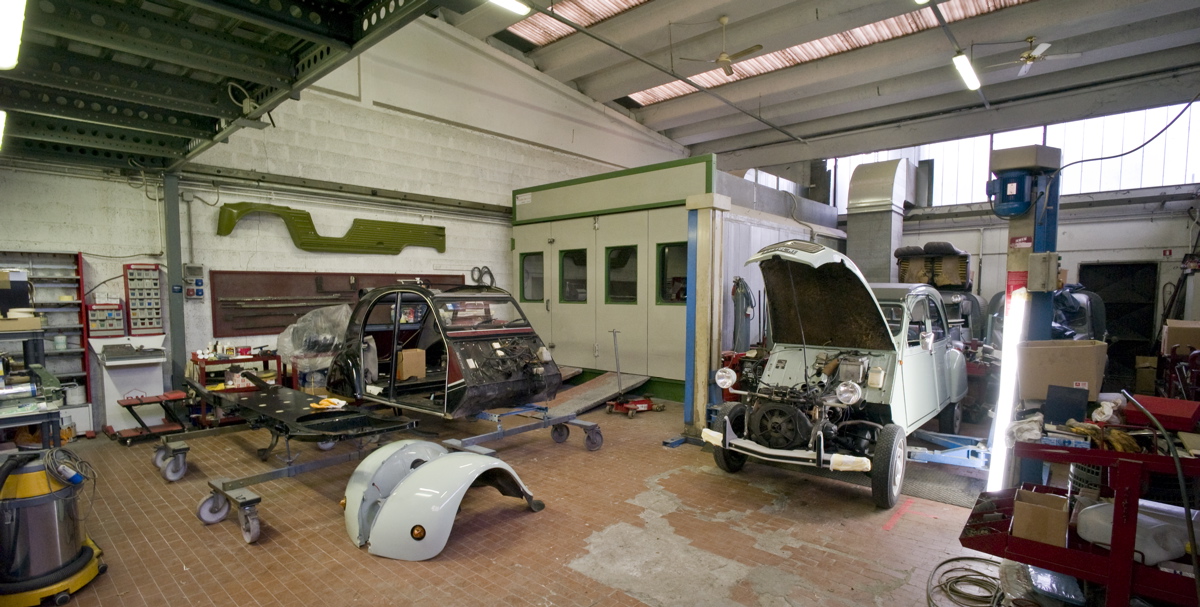 L’atelier 2cv si trova a Bareggio, alle porte di Milano e si dedica alla riparazione, alla manutenzione e soprattutto al restauro delle Citroen 2CV e dei modelli derivati come le Dyane, le Mehari, le AMI, le furgonette AU, AZU, AK ed Acadiane.
